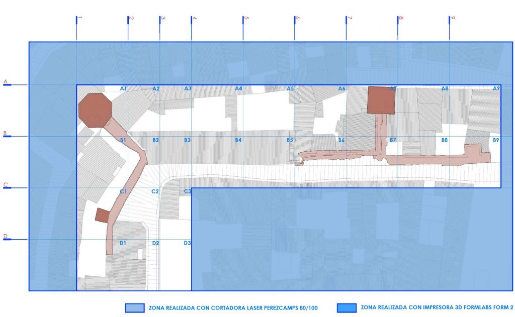 En el esquema también vemos una zona en azul que representa el entorno un poco más alejado de edificios. Este entorno fue realizado mediante la cortadora laser. Se simplificó a partir del parcelario del Casco Histórico.