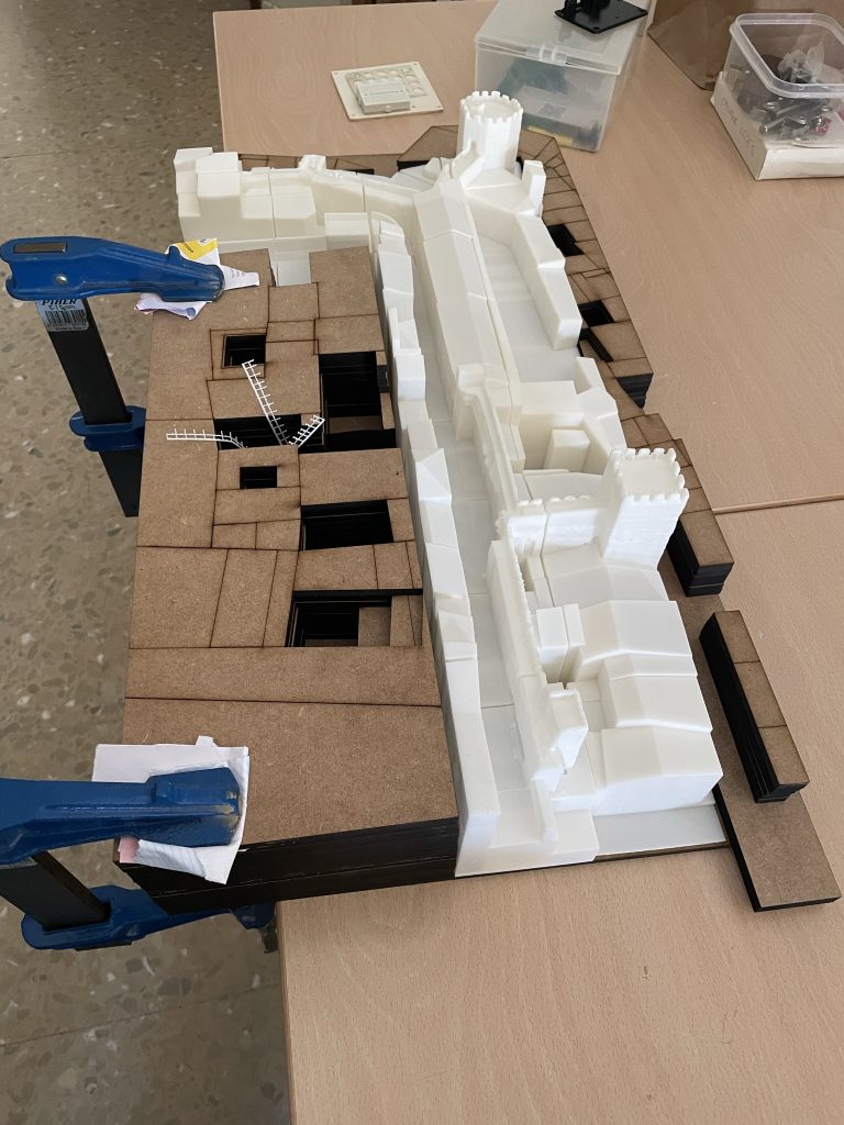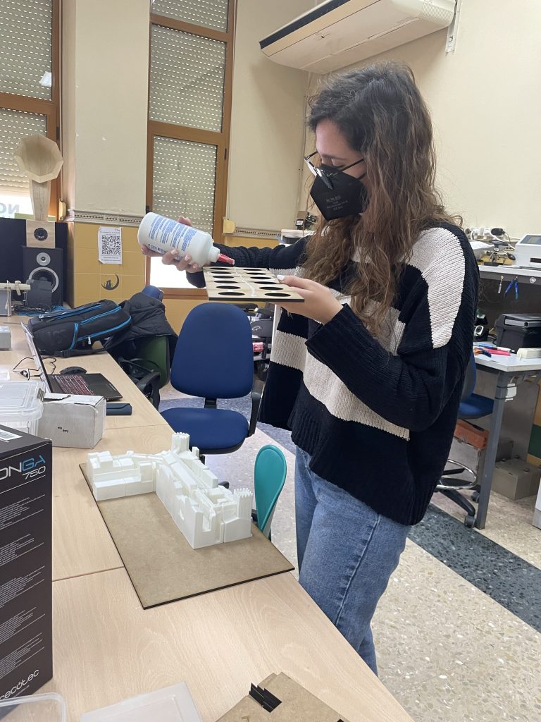 Una vez obtenidas las diferentes piezas de la maqueta tanto en resina (obtenidas con la impresora Form2) como los tablero DM (obtenidos con la cortadora laser) se ha procedido a su lijado, encolado y ensamblado. Estas tareas se han realizado gracias a las herramientas del Garage Lab. Os dejamos unas fotos del proceso… Destacar que el comportamiento de la resina usada ha sido muy similar al de la madera, se ha podido lijar e incluso cortar sin problema con instrumento de madera.