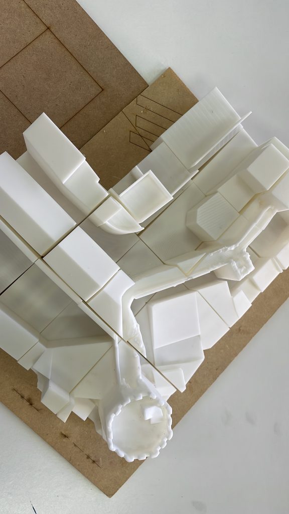 El procesado de este “gemelo” se ha llevado a cabo mediante el software Rhinoceros 3d. Desde este programa se han montando y refinado la malla tridimensional. Nos hemos centrado en el entorno de la muralla y hemos modelado de forma simplificada las viviendas adosadas. Una vez se finalizada esta primera fase de modelado se ha procedido a dividirla en fragmentos de acuerdo al límite físico que nos impone el modelo de impresora que hemos utilizado (form2) que es de 145 × 145 × 175 mm. En total se han planificado 24 cortes señalados en el esquema que vemos abajo. Estos 24 cortes han supuesto 1907,83 ml de resina white (sin contar las pruebas de impresión), han sido utilizadas también dos unidades de “resin tank” ¡y se han invertido un total de 203 horas solamente de impresión!… sin tener en cuenta el tiempo de limpieza y curado (realizado con las máquinas formwash y formcure también del 3dlab) ni el tiempo invertido en pulido, lijado etc… (realizado en el garage lab)
