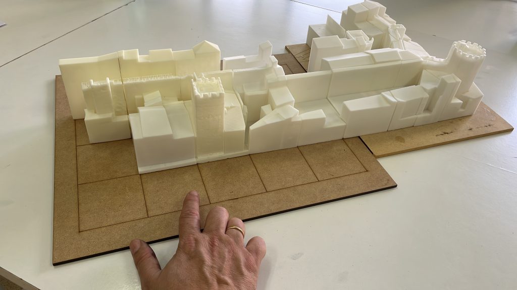 Durante el mes de enero de 2022 hemos desarrollado un proyecto de fabricación digital de un tramo de la muralla de Cáceres.  Se trata de los fragmentos de lienzo ubicados entre la torre Ochavada y la torre del Aver. Previamente trabajamos durante todo el mes de diciembre realizando distintas pruebas con los equipos de SOL y nos hemos capacitado en el uso de los mismos (gracias Mario Figueira Torres y Antonio Gordillo Guerrero por vuestra paciencia, ayuda y por habernos enseñado). En estas pruebas hemos testeado muchas cosas: compatibilidad de formatos de archivo, procesado del modelo digital para adaptarlo a nuestras necesidades, material, tamaño, resolución, etc…
