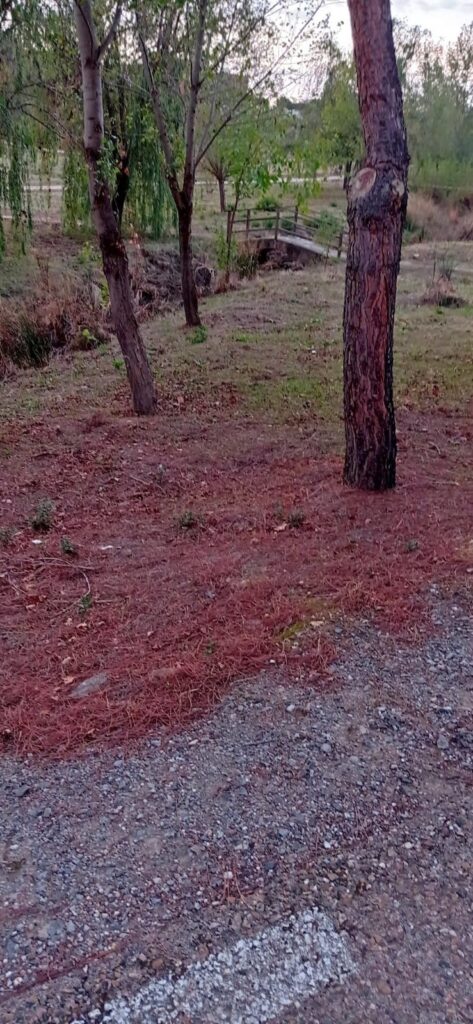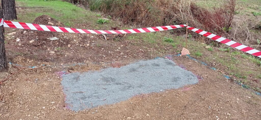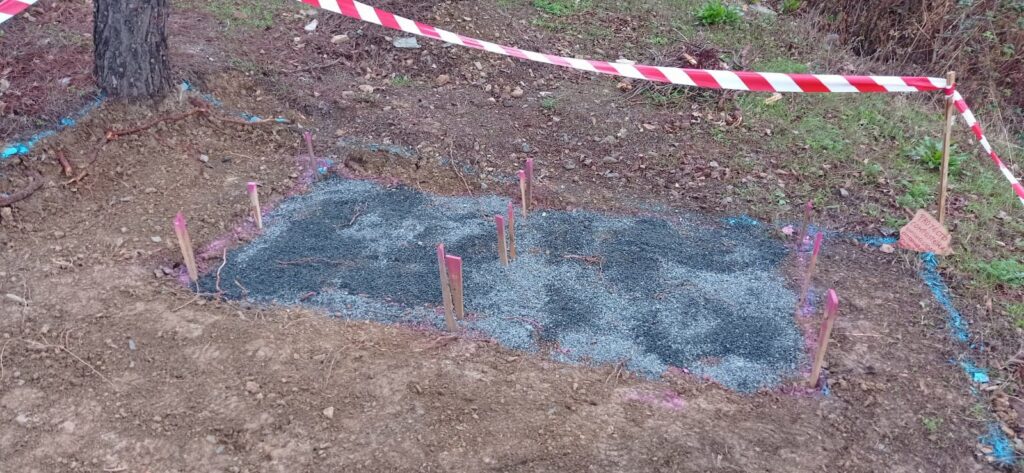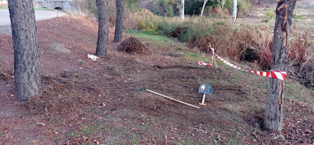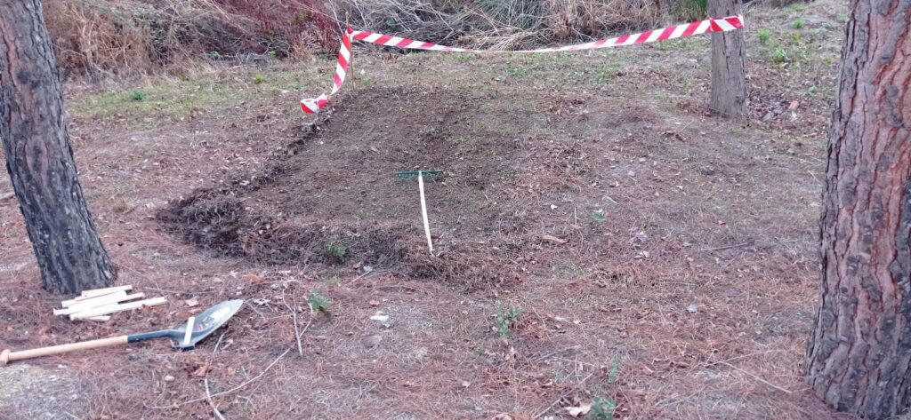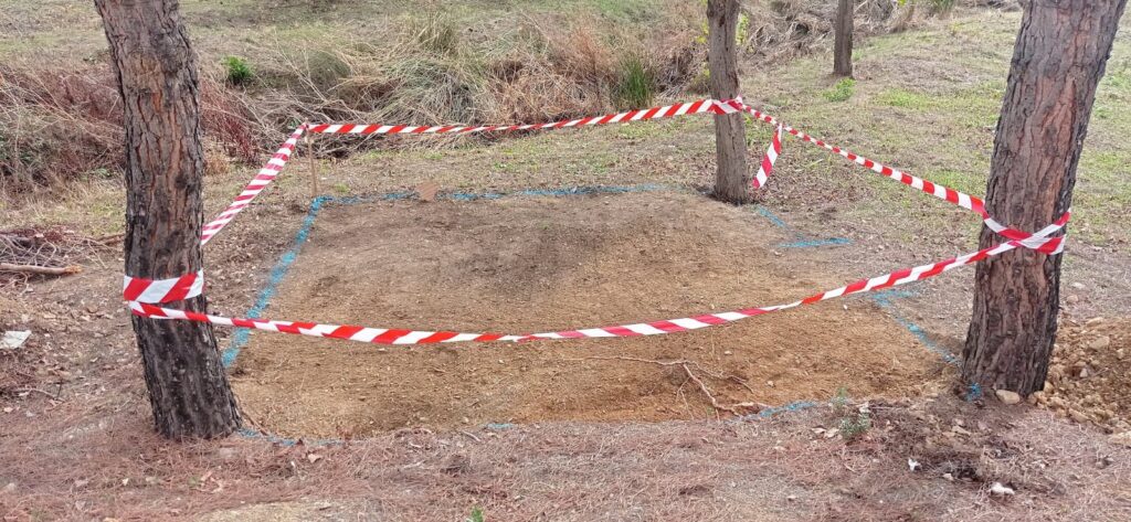 En nuestro caso, el sitio elegido es un parque de uso público en el campus universitario de Cáceres al lado de un riachuelo sin demasiada pendiente. Una vez elegido el lugar adecuado, se procederá a la limpieza y nivelado del terrero si fuera necesario.