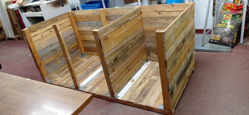- Asegurarse de que todo está saliendo según lo reflejado en los planos y reforzar los, frentes, traseras, puertas y costados de la compostera con piezas de madera para evitar rupturas futuras.