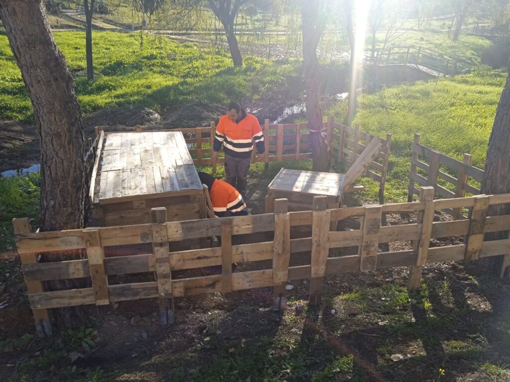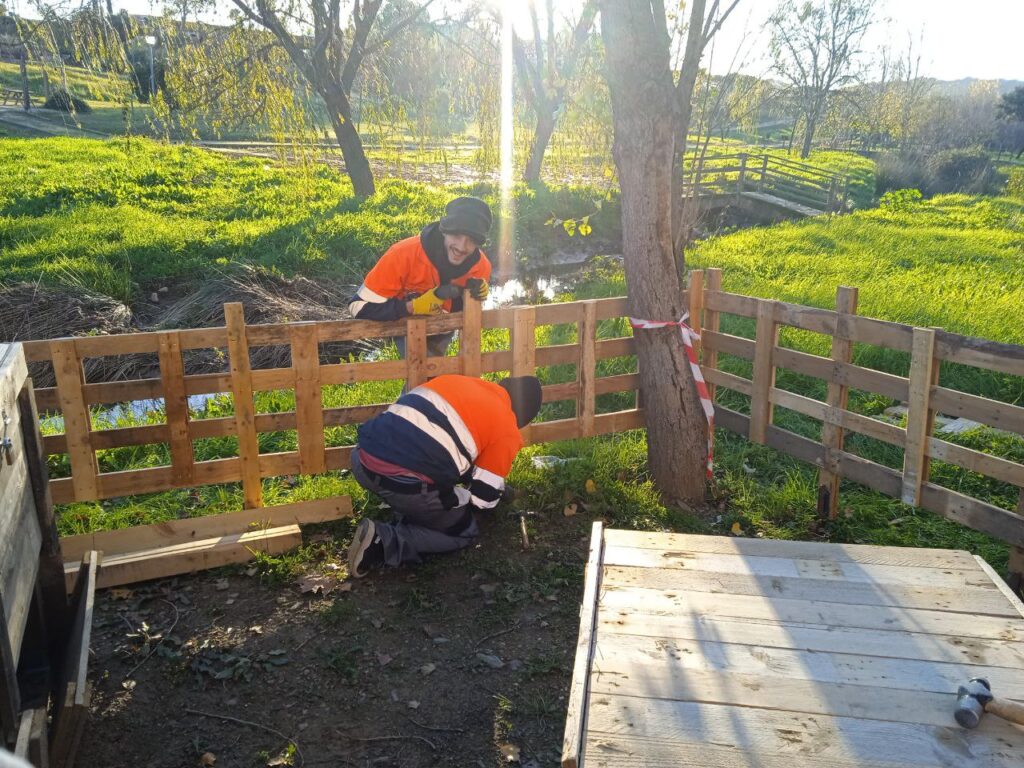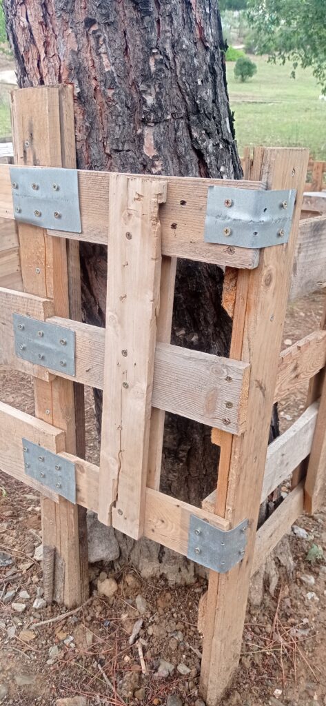 - Para instalar las vallas y evitar que se caigan. Se han utilizado listones de madera de 1000 x 50 x 50 clavados en el suelo con hierros y reforzado por escuadras metálicas.