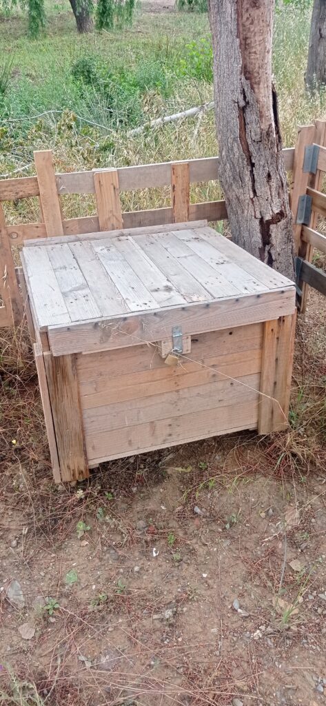 - Como remate final y último paso, colocar cerrojos en las cavidades de las composteras y en la puerta para evitar problemas futuros de vandalismo. Por otro lado se hizo una caja de almacenamiento para guardar ramas, hojas, cáscaras y otros residuos orgánicos.