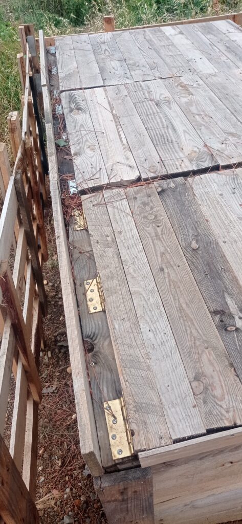 - Para la fabricación del techo, realizar la misma operación que en el paso anterior. El techo está formado por una puerta abatible de 900 x 900 unidas con bisagras a un listón de refuerzo colocado en la trasera de las composteras para que pueda hacer su función.