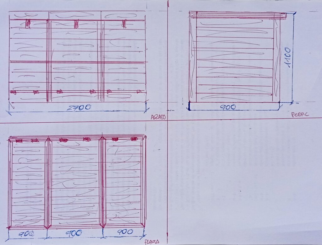 - Dibujar croquis, bocetos o planos necesarios con las dimensiones reales de la compostera que vamos a fabricar. Teniendo en cuenta el lugar de instalación y dependiendo de cuantas cavidades queramos construir. En nuestro caso es una compostera formada por 3 cavidades. Cada cavidad, tiene unas dimensiones de 900 de ancho x 900 fondo x 1000 de altura lo que hace un total de 2700 de largo x 900 de fondo x 1100 de altura [tener en cuenta que al poner los listones para que la base de la compostera este protegido de la humedad, la compostera sube 100 más en altura].