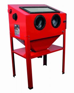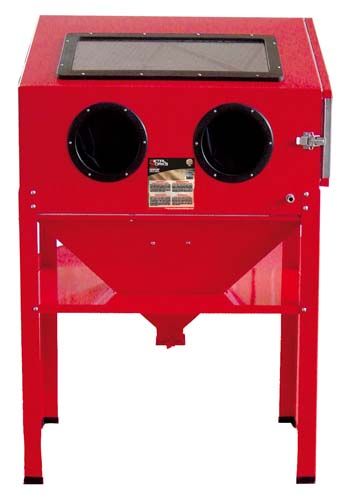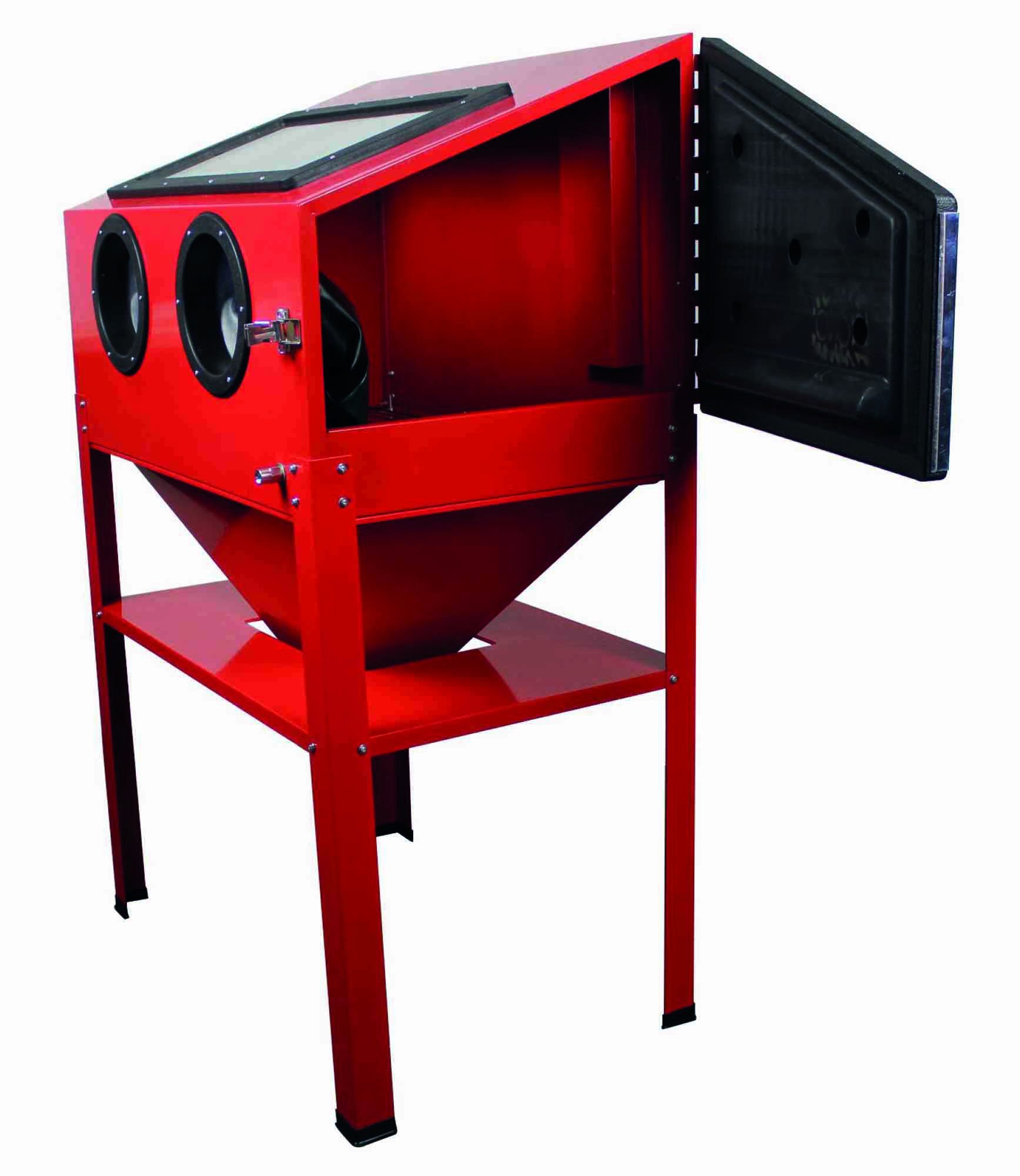 La cabina chorreadora de Arena CAT410 de Metal Works dispone de un espacio de trabajo robusto y cubierto de 220 litros con una ventana de visualización.