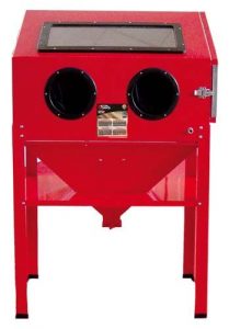 Cabina de acero hermética que permite trabajar con materiales como corindón, arena de sílice, óxido de aluminio o perlas de vidrio.
