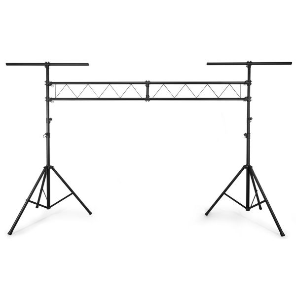 Incluye dos tripodes con tubos telescopìcos regulables hasta 4 metros (el ultimo tramo se separa) y un truss de barras paralelas para luces de 3m, incluye dos barras en “T” con puntos de agarre para 4 focos, soporta un maximo de 60Kg