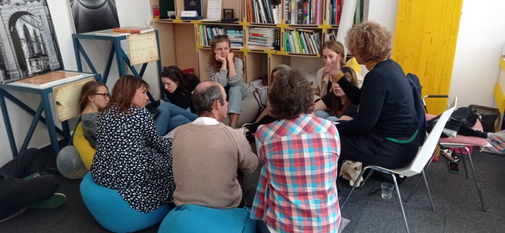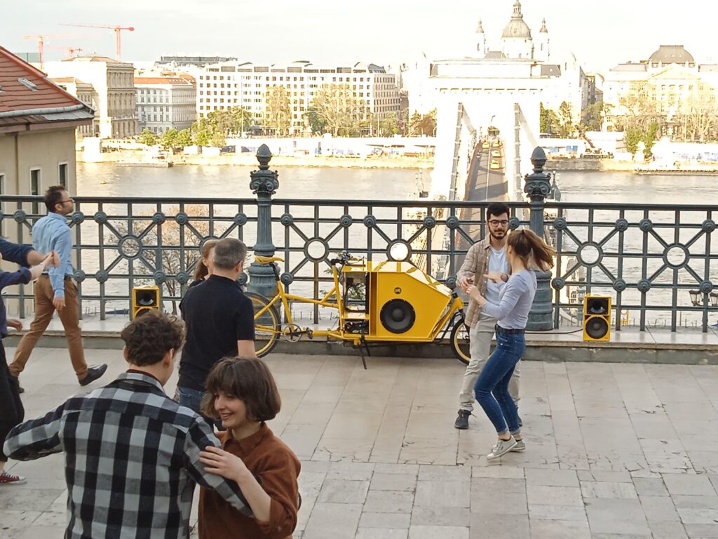 El taller de Éva Bubla “Proyectos de arte específicos del sitio y sintiendo la ciudad” se centró en la cuestión de cómo percibimos la ciudad más allá de lo visual. El tacto, el oído y el olfato fueron los ejes principales del paseo por la ciudad que dirigió. Anna Szepes , instructora de teatro, presentó al equipo internacional el centro de la ciudad de Kelenföld, el área de acción del equipo de Budapest, desde una nueva perspectiva a través de intervenciones inusuales en el espacio público. La sesión, entre otras, incluyó un baile silencioso en el metro y el desarrollo de una ruta única para aquellos que también buscan situaciones inusuales en la ciudad.
