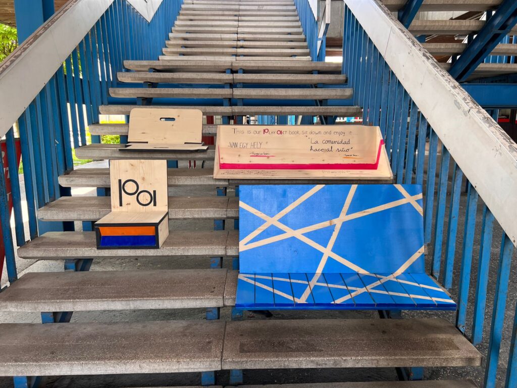 - Fabricación y diseño de muebles temporales de madera (taburetes, bancos) bajo la dirección del equipo KÖZMŰ.