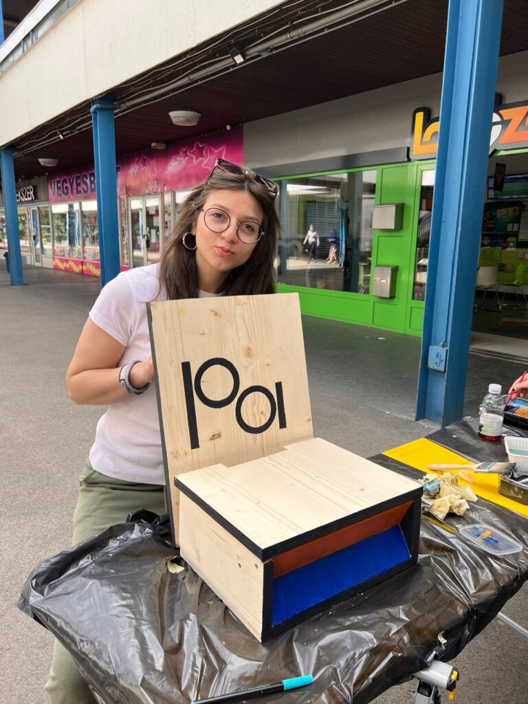 Los dos últimos días estuvieron a cargo de KÖZMŰ – Közös Műhely , desde donde nos acompañaron la fundadora Réka Holánszki y su colega Ádám Tóth . Durante los dos días, todos pudieron experimentar cómo las ideas se hacen realidad. La tarea era que cada equipo diseñara asientos de madera, que luego se colocaron en el centro de la ciudad de Kelenföld. Gracias a los fantásticos líderes del taller, incluso aquellos que nunca antes habían trabajado en entornos similares o con materiales similares pudieron pasar del diseño a la implementación. El diseño, la construcción y la pintura del mobiliario se llevaron a cabo in situ en el centro de la ciudad de Kelenföld, por lo que los residentes locales que pasaban por allí también pudieron seguir el desarrollo de la obra.