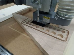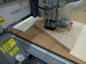 El único problema era sujetar el pequeño retal a la base utilizando la bomba de vacío (y no mordazas), pero se solucionó bien ajustando las entradas de aire y colocando bien la pieza. El modelo que se sacó de la pieza, quedaba bastante justo en la madera, como puede verse en las fotos.