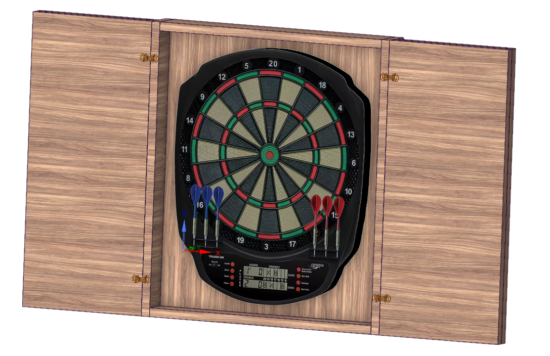 Una vez con las maderas cortadas, se realizó el ensamblaje de toda la diana excepto la portada. Para ello, los paneles principales se han unido mediante agujeros de bolsillo, mientras que los listones frontales que conforman el marco para la portada se han pegado a las puertas con cola para madera. Las puertas de la cabina se han integrado utilizando bisagras de barril, ya que estas quedan totalmente ocultas mientras que las puertas están cerradas.