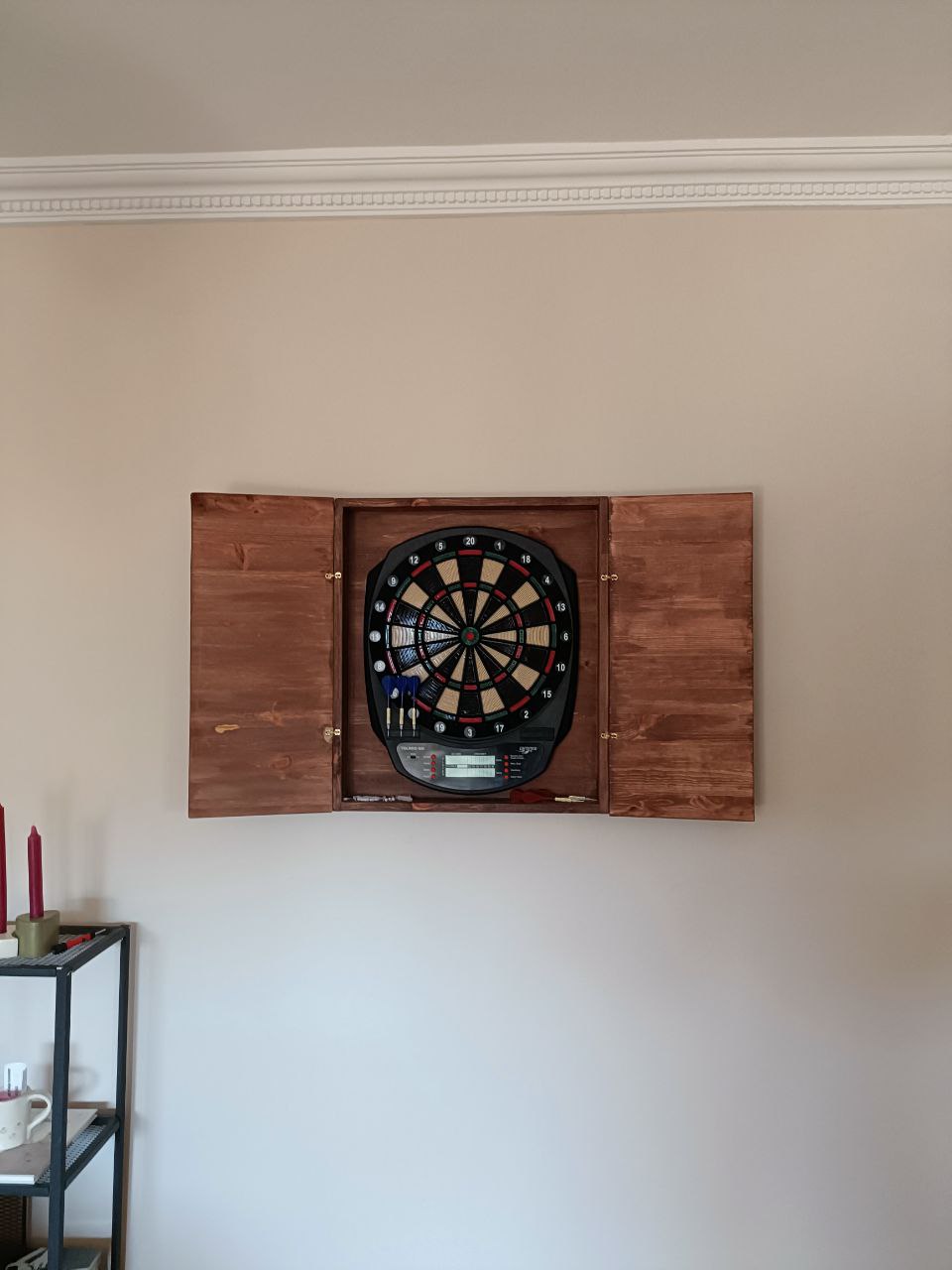Con la cabina montada, el siguiente paso fue darle un colorante al agua color nogal. Este paso no seria necesario, pero cambia la estética de la madera, y en mi caso particular le daba una estética más acorde con el resto de muebles. Antes de tintar es necesario lijar toda la superficie de la diana, que además ayudará a suavizar esquinas e igualar bordes. Tras dejar secar el tinte se aplicó una capa de cera para dar protección a la madera.