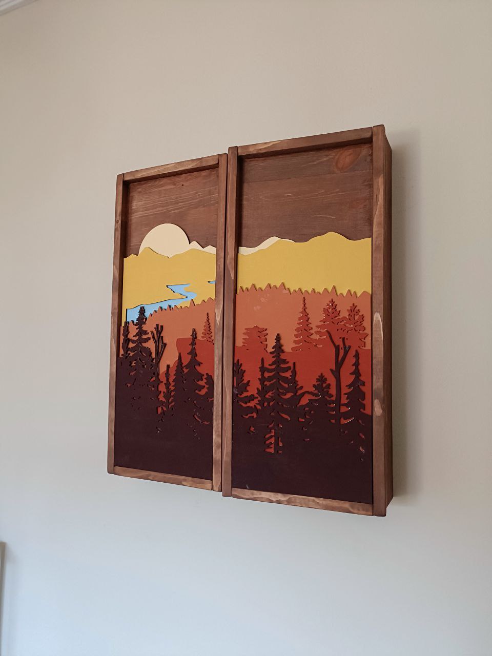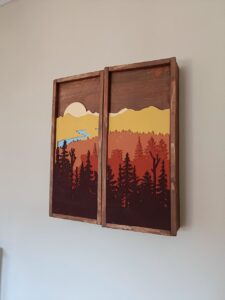 Se decidió realizar una técnica multicapa en la que se superponen varios paneles cortados generando un efecto de profundidad. Es posible realizar este tipo de diseño manualmente, sin embargo, como es algo laborioso, en este caso se decidió por comprar los archivos de diseño en Etsy. Al ser simplemente archivos digitales de fabricación el coste es bastante bajo, y hay mucha variedad de diseños de todos los estilos. En este caso el diseño pertenece a la tienda NTDArts. La tienda envía el archivo DXF correspondiente a cada una de las capas, por lo que el siguiente paso fue adaptar estos archivos a las dimensiones de la cabina. Como la fabricación fue manual, se midió sobre la cabina en físico una vez construida, en lugar de tomar como referencia las del modelo CAD.
