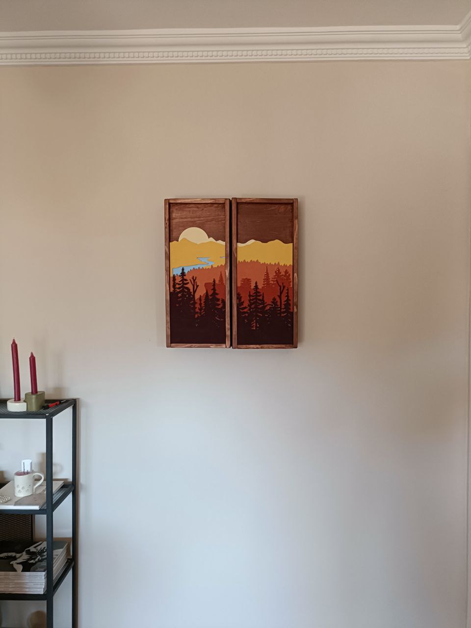 El siguiente paso era pintar los paneles cortados. Cada capa va pintada de un color (la que contiene el rio, de dos). Para ello primero se lijó la parte delantera de cada capa y se aplicó una imprimación universal. Con la imprimación seca, se pintó con pintura acrílica cada panel, aplicando dos capas de pintura en cada uno de ellos. Finalmente, el ensamblaje final de los paneles en las puertas de la diana se hizo utilizando cola para madera, dejando unos minutos aplicando fuerza entre capa y capa.