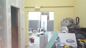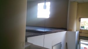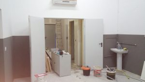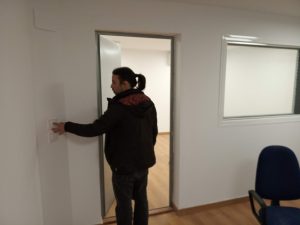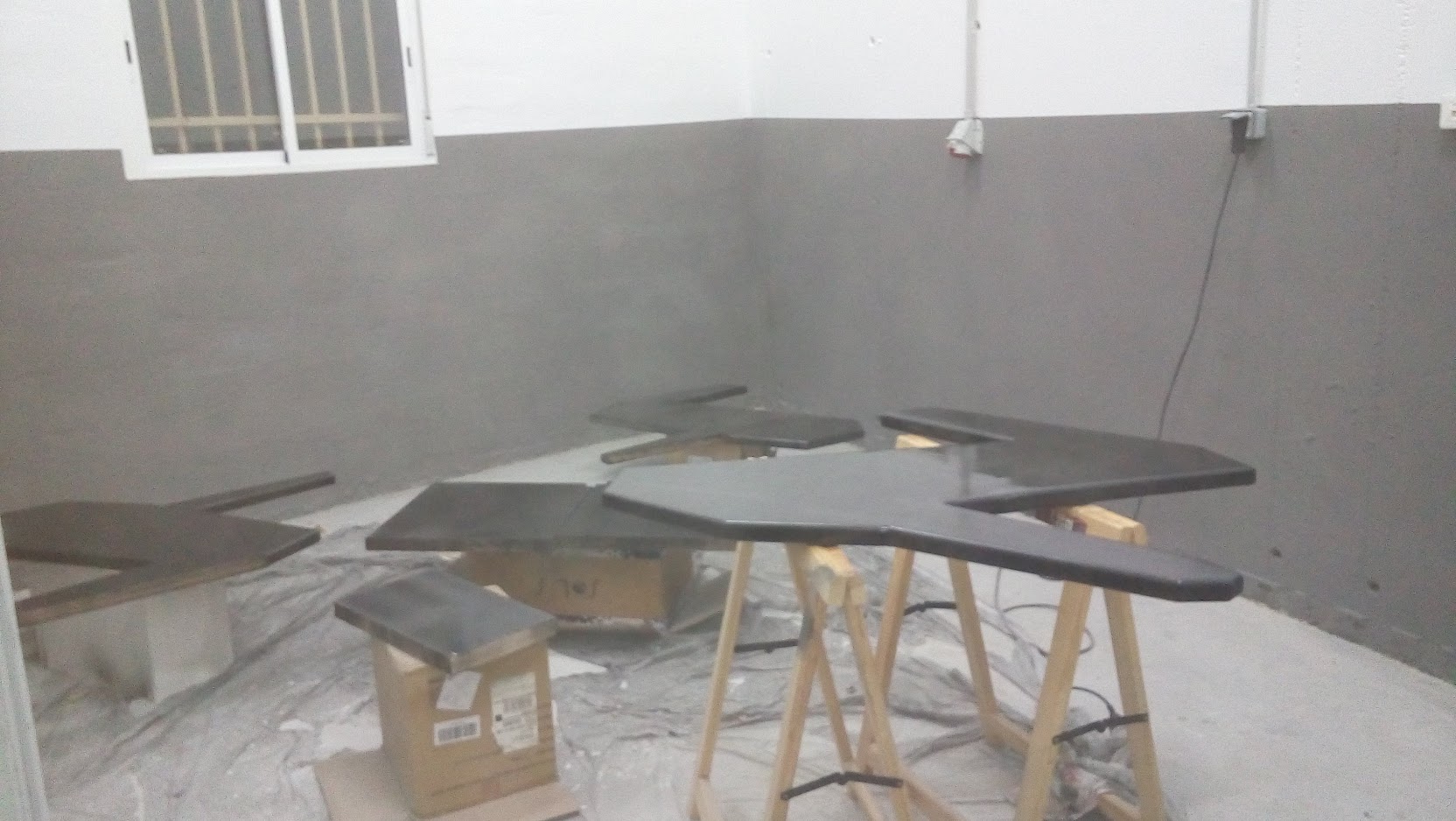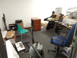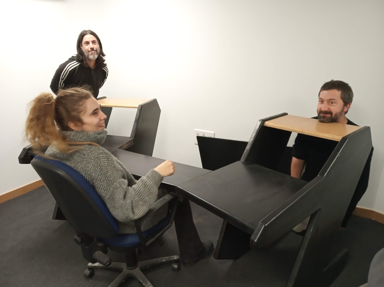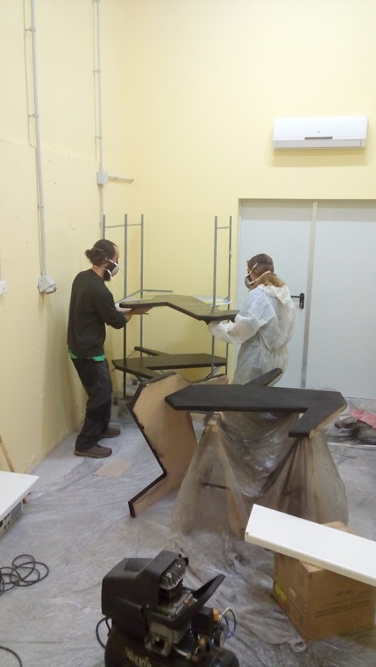 Respecto al mobiliario, puede verse cómo se construyó y colocó la mesa de la sala de producción, y el mueble para los conectores entre salas. También se añadió una cajonera de despacho, y un sofá de esquinera en la sala de producción, ambos reutilizados.