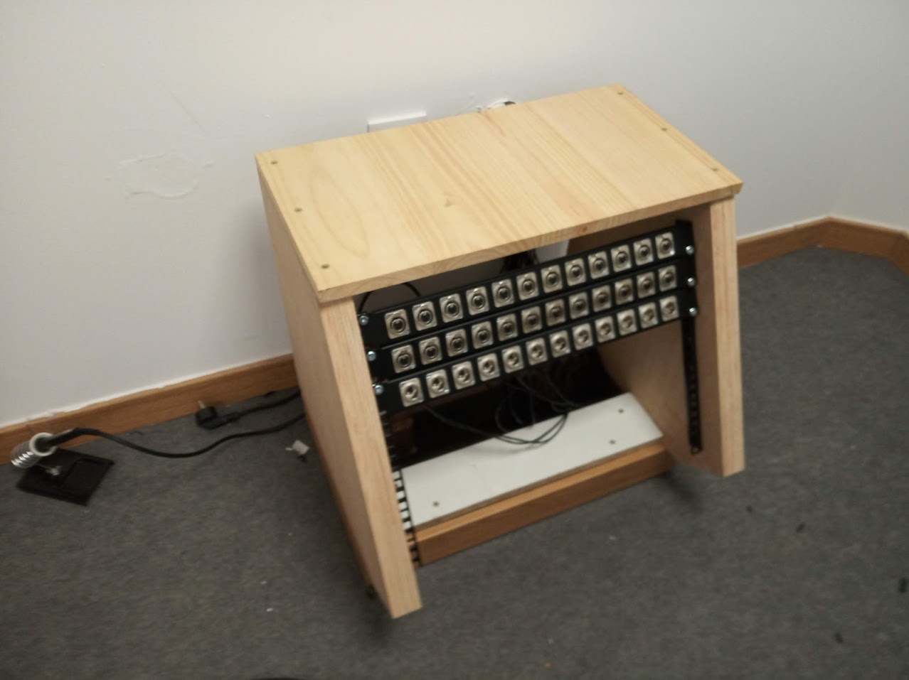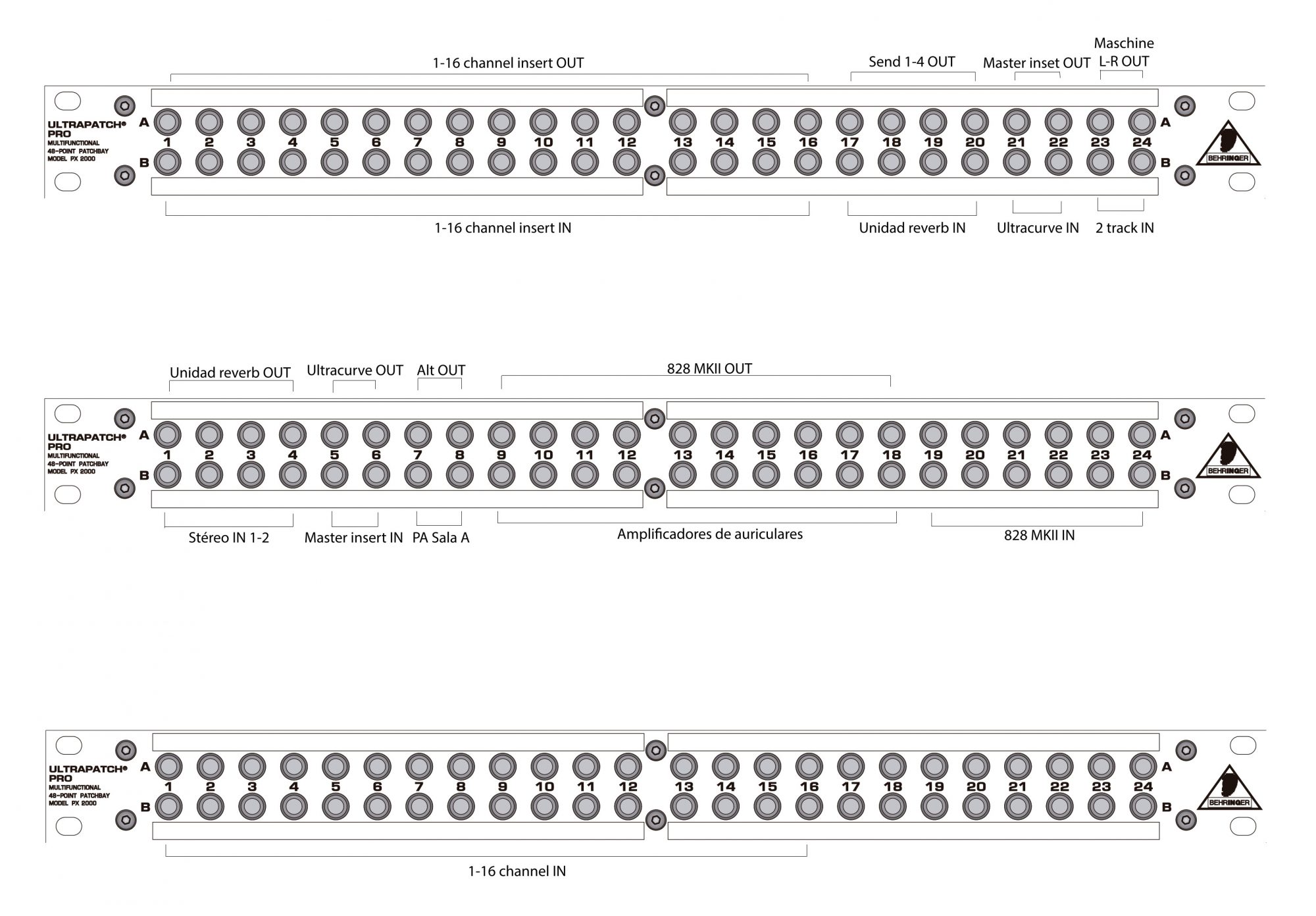 La idea principal es que todos los equipos están conectados a las unidades de conexionado por defecto. Es decir, que no hay que conectar o desconectar cables de ningún equipo fijo. Todo se conecta a las unidades de conexionado en los racks. Sean microfonos, o instrumentos, o conexiones entre equipos… todo se hace con cables que llegan a los módulos enrackados, no a los equipos directamente.