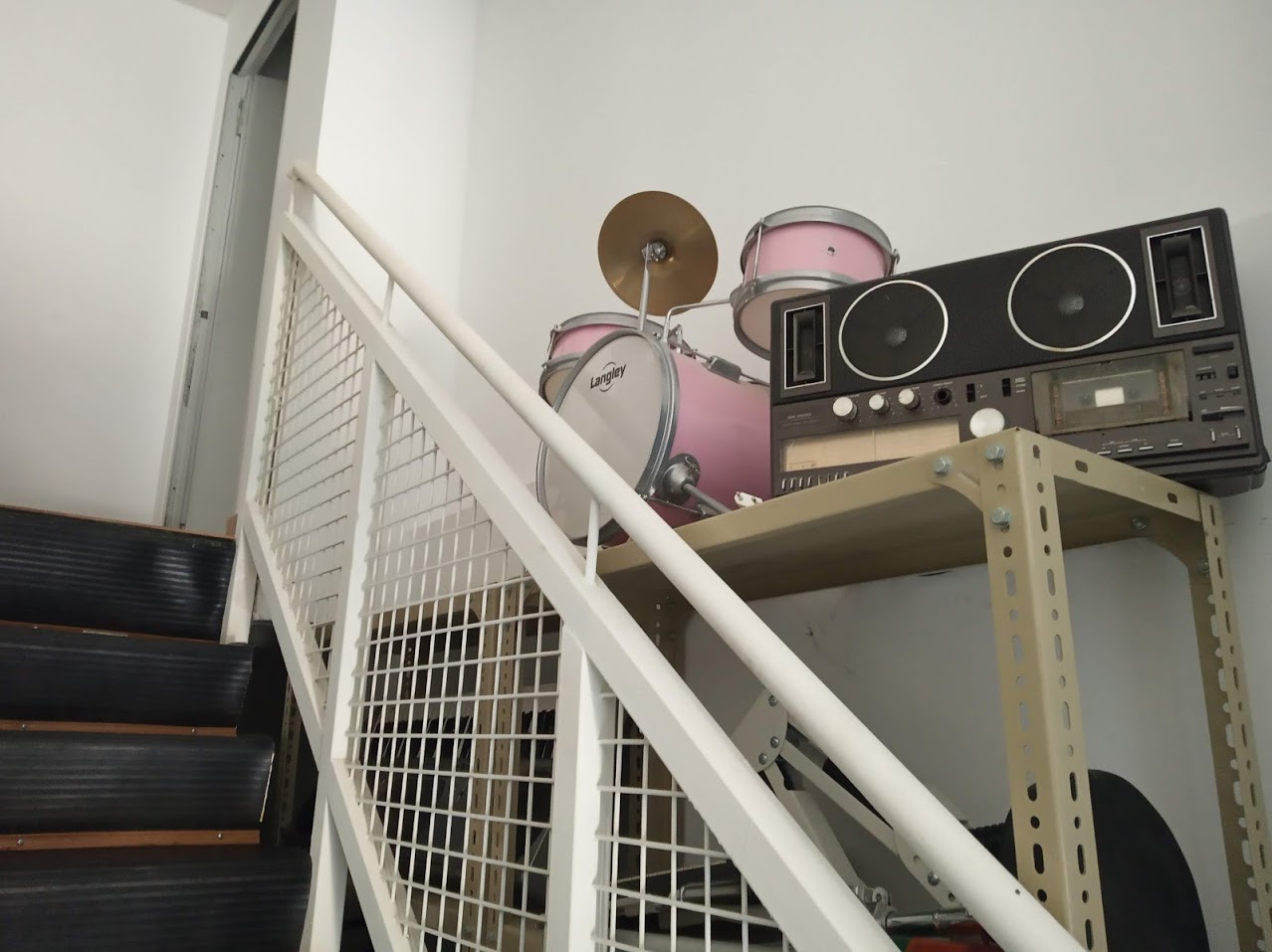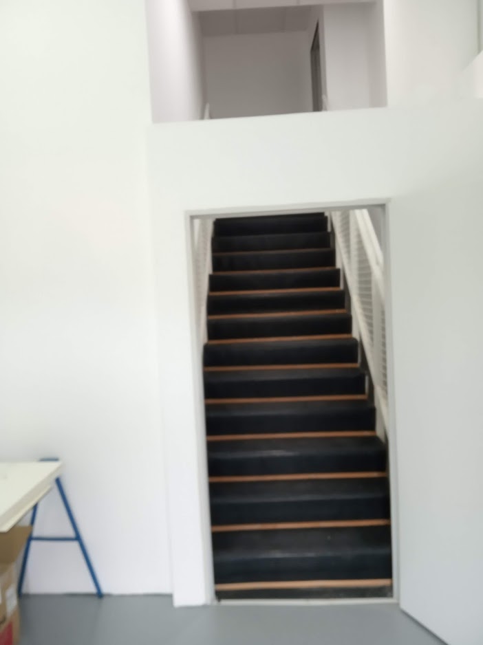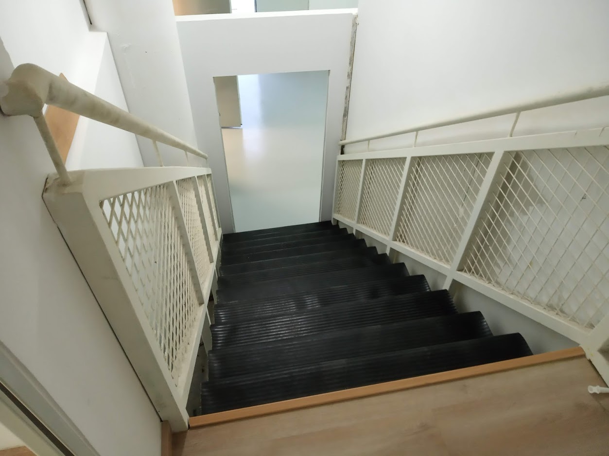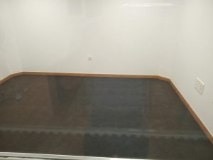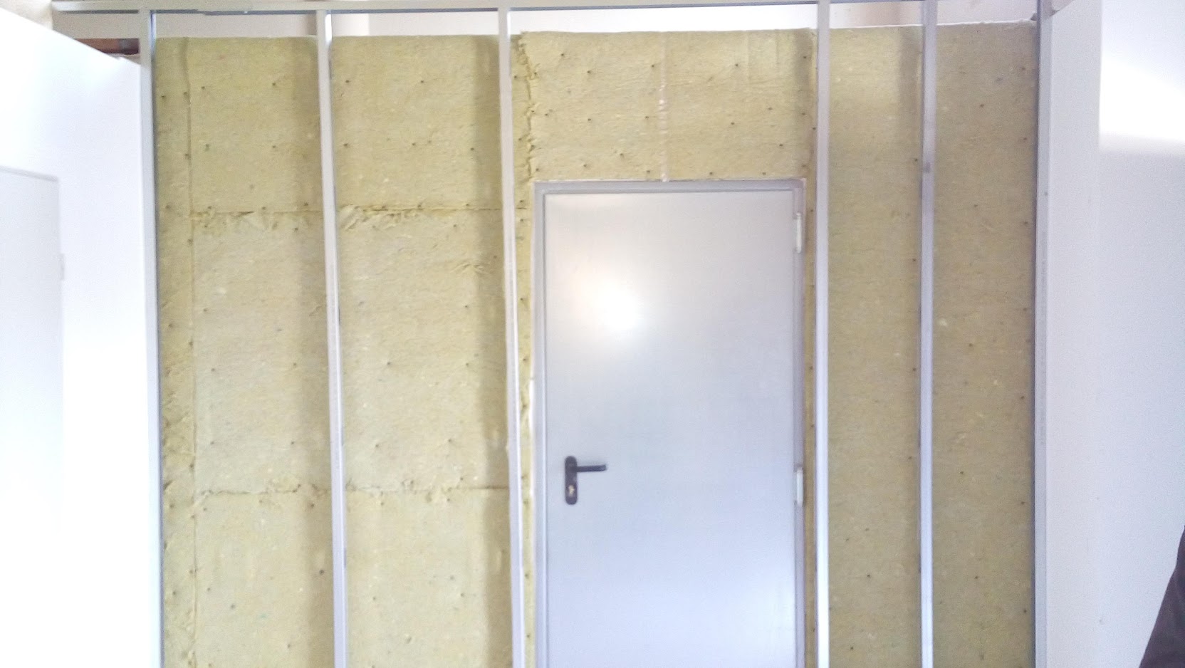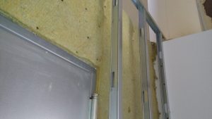 La insonorización de la escalera se mejoró utilizando láminas de espuma de poliuretano densa cortadas a la medida de cada escalón, fijadas al suelo con tornillos y cubiertas luego con goma negra antideslizante. Quedó una escalera con escalones acolchados; algo extraño pero que funciona bien. En la pared frontal de las salas se añadió un recubrimiento extra de 15cm de lana de roca, sujeto entre paneles normales de Pladur.