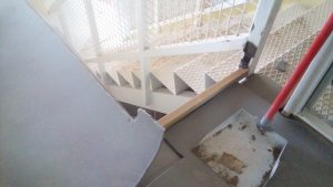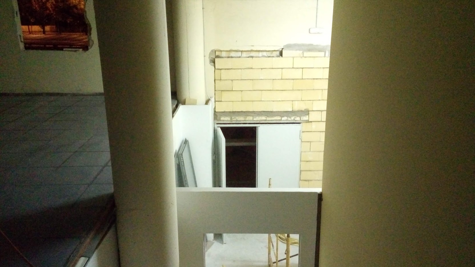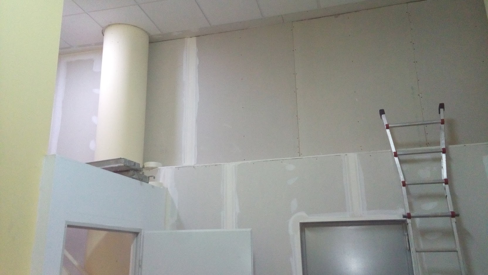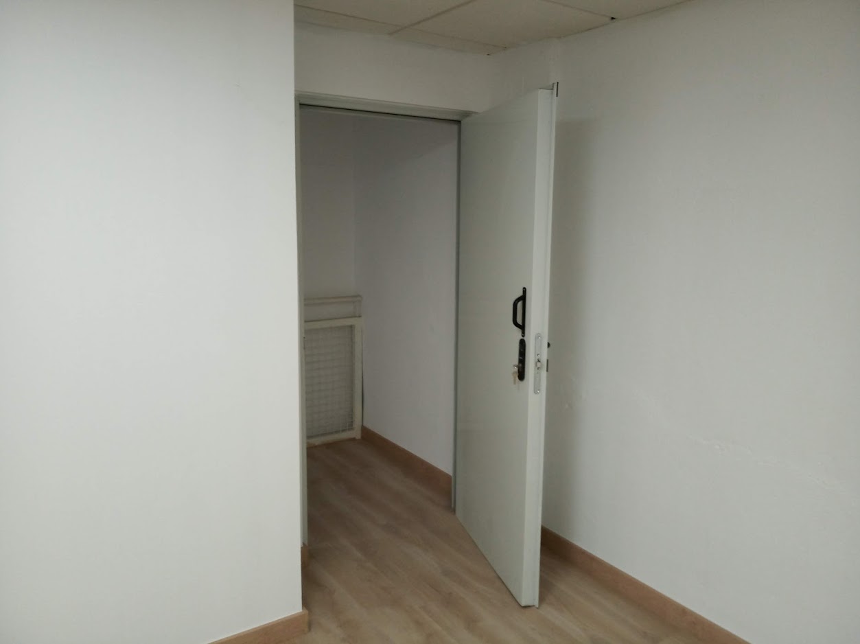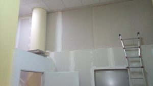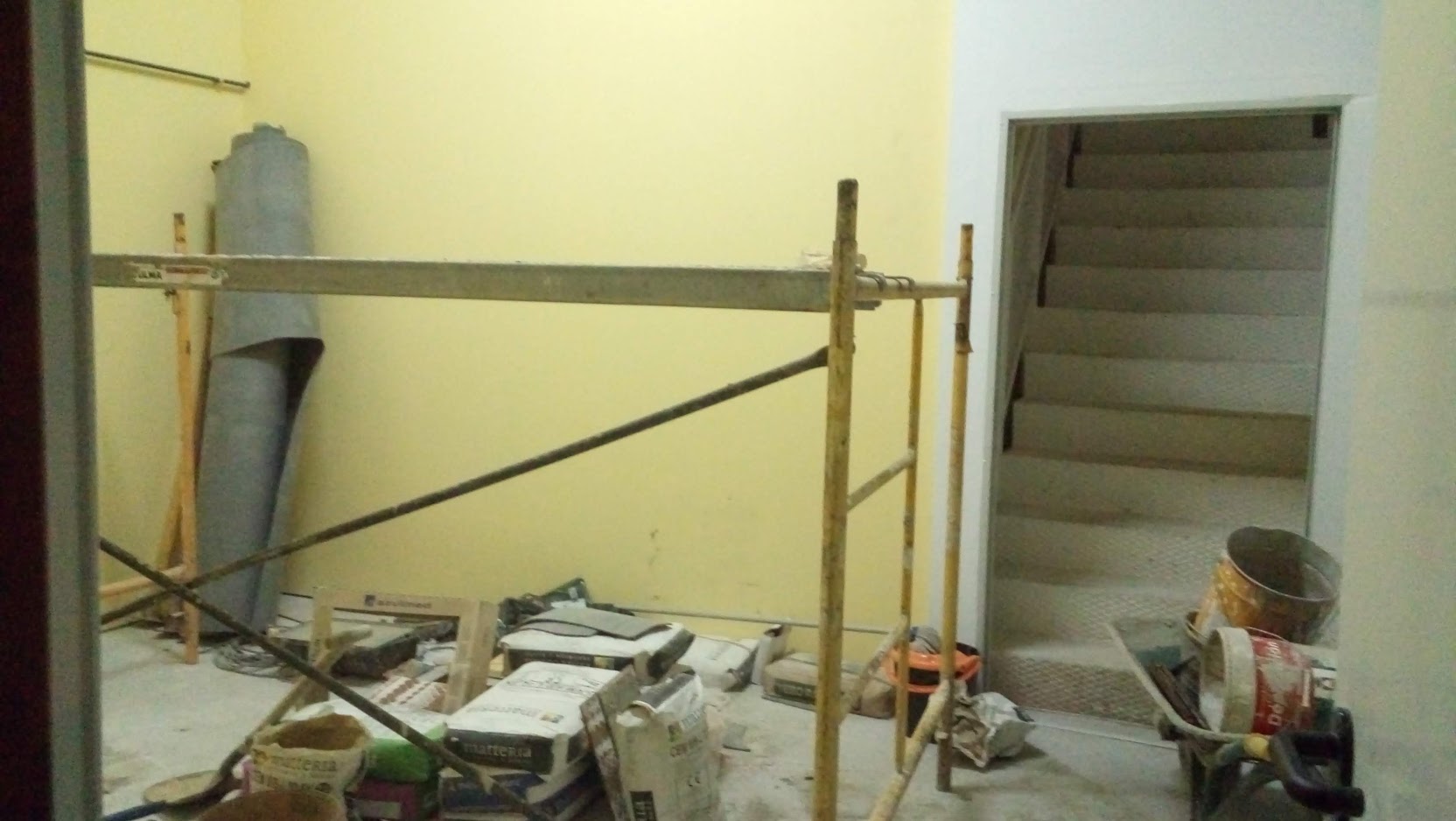 La insonorización de la escalera se mejoró utilizando láminas de espuma de poliuretano densa cortadas a la medida de cada escalón, fijadas al suelo con tornillos y cubiertas luego con goma negra antideslizante. Quedó una escalera con escalones acolchados; algo extraño pero que funciona bien. En la pared frontal de las salas se añadió un recubrimiento extra de 15cm de lana de roca, sujeto entre paneles normales de Pladur.