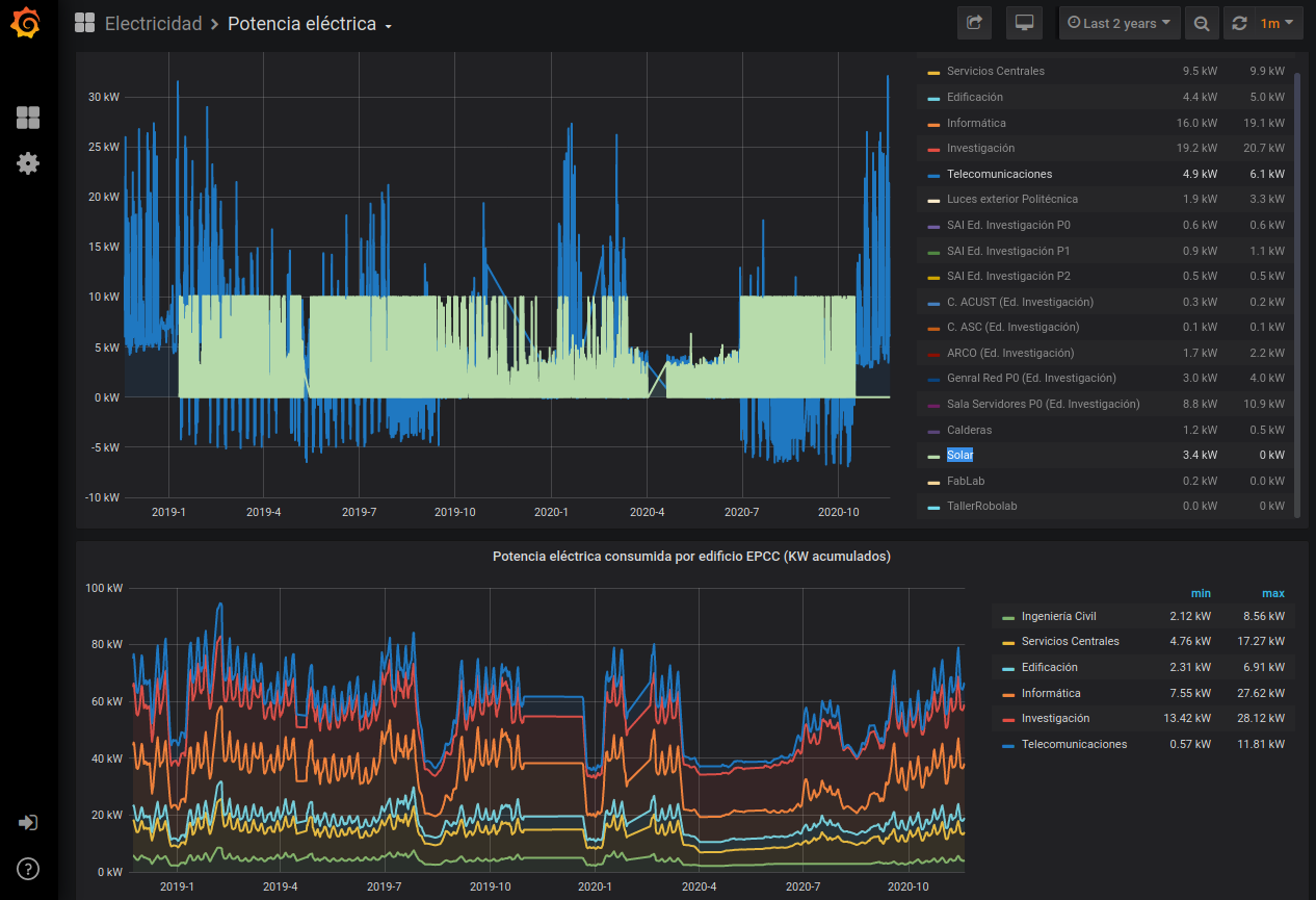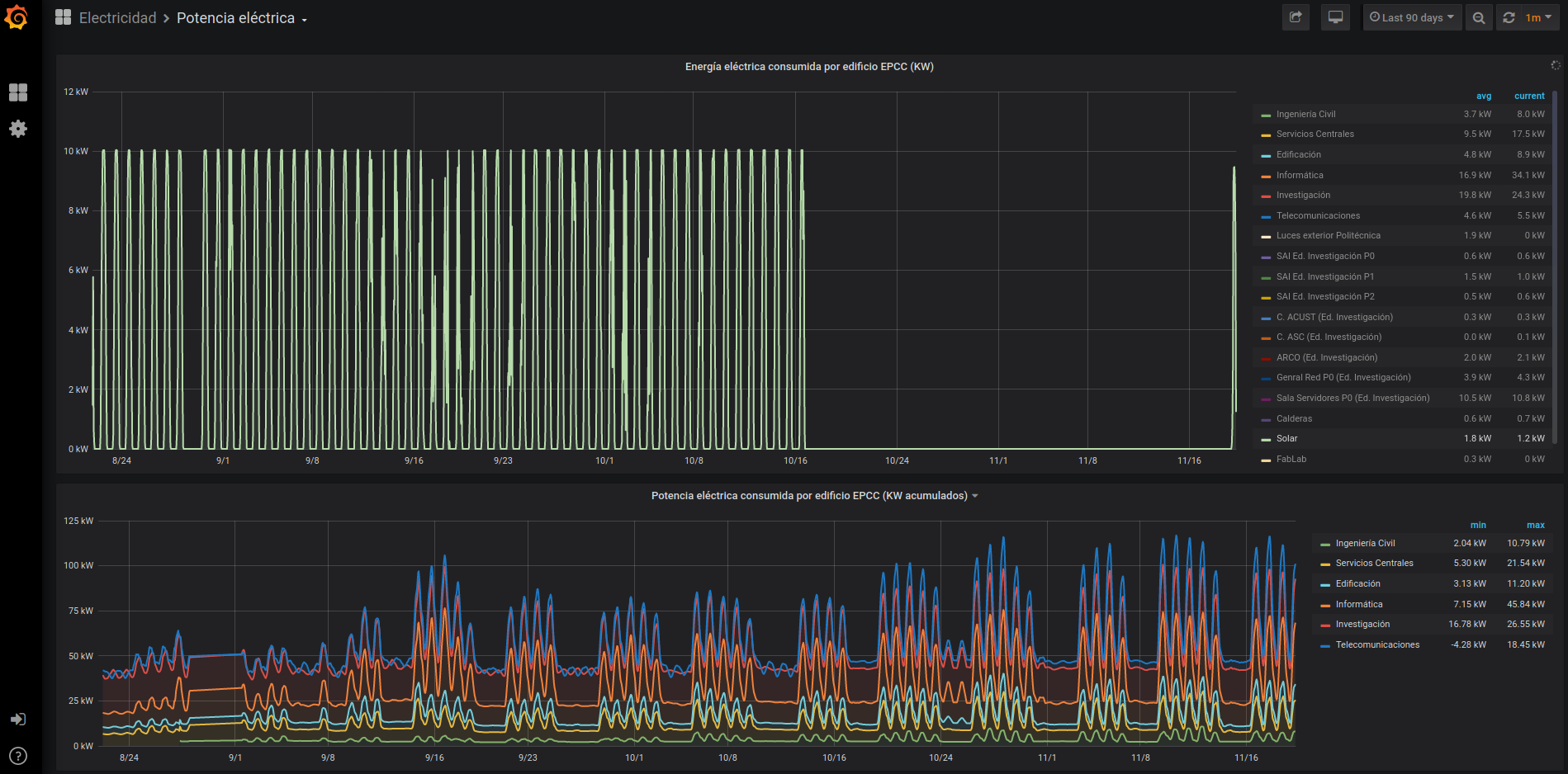Además el sistema se integró en el resto de mediciones de SmartPoliTech, que cuenta con más de 200 sistemas de sensorización desplegados por toda la Escuela Politécnica de Cáceres y que permiten medir variables ambientales y consumos de gas, luz y agua, entre otras cosas. Pueden consultarse todas las medidas aquí. El sistema se ha montado combinando distintos tipos de sensores inalámbricos (muchos usando ESP8266) que muestran sus datos utilizando un sistema basado en Grafana.