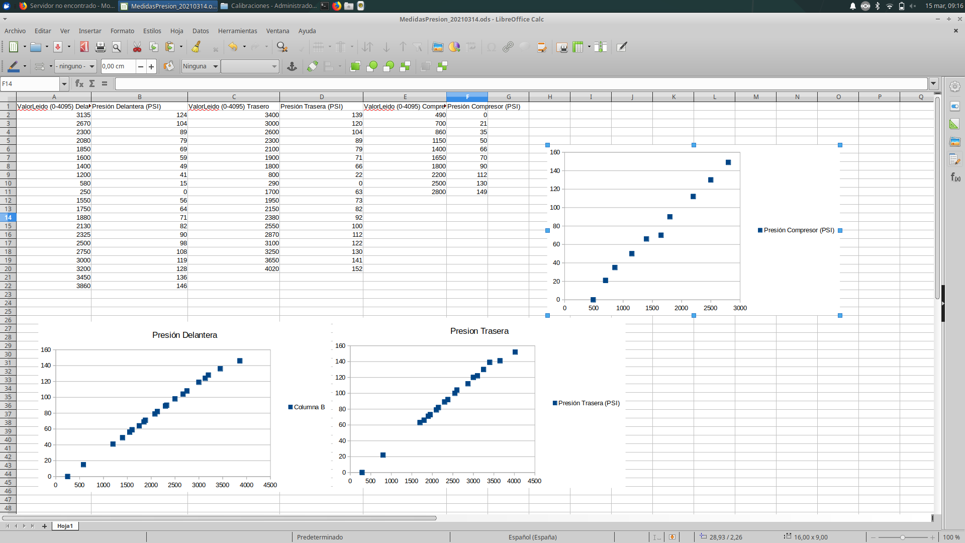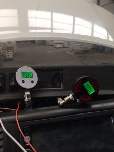 Los sensores de presión han sido sencillos de colocar y utilizar. Funcionan como simples divisores de voltaje; es decir que reciben alimentación positiva (3.3V) y tierra por dos cables, y por el tercer cable devuelven un valor de voltaje proporcional a la presión ejercida sobre el sensor. Tienen un rango justo pero suficiente, llegan a medir hasta 1.2 MPa (175 PSI). Después de hacer una calibración rápida utilizando otros sensores digitales observamos una linealidad más que aceptable. Pueden verse los datos en la galería. Sus valores son leídos en el ESP32 como simples entradas analógicas.