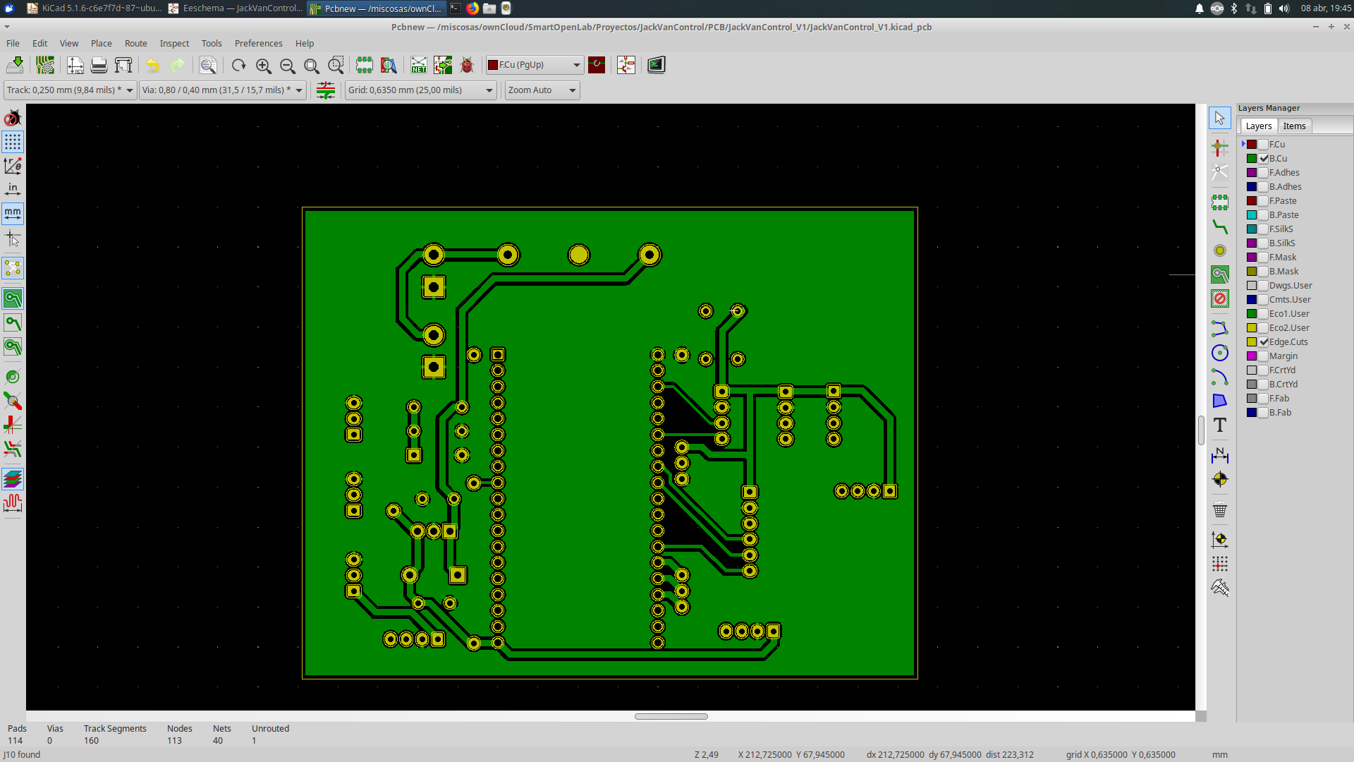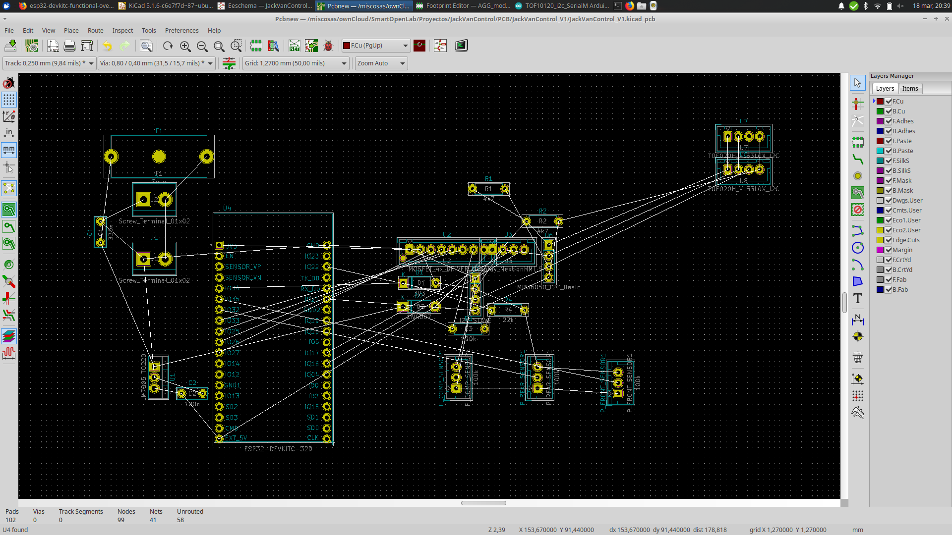 Decidimos usar como controlador central al microcontrolador ESP32, que es potente y versátil; proporciona entradas y salidas suficientes y, gracias a sus múltiples posibilidades de comunicación, permite conectar sensores y actuadores fácilmente. La alimentación del controlador se realiza a través del clásico LM7805 que se alimenta a través de la batería del vehículo y regula su salida a +5V, y de un LM1117, que proporciona +3,3V. Se añaden condensadores de filtro, fusible y diodos de protección.
