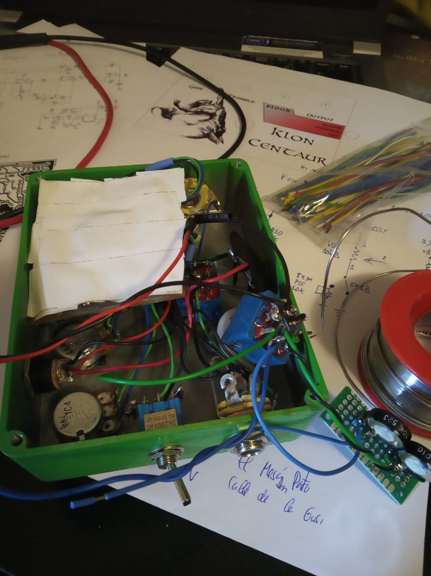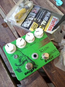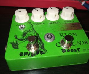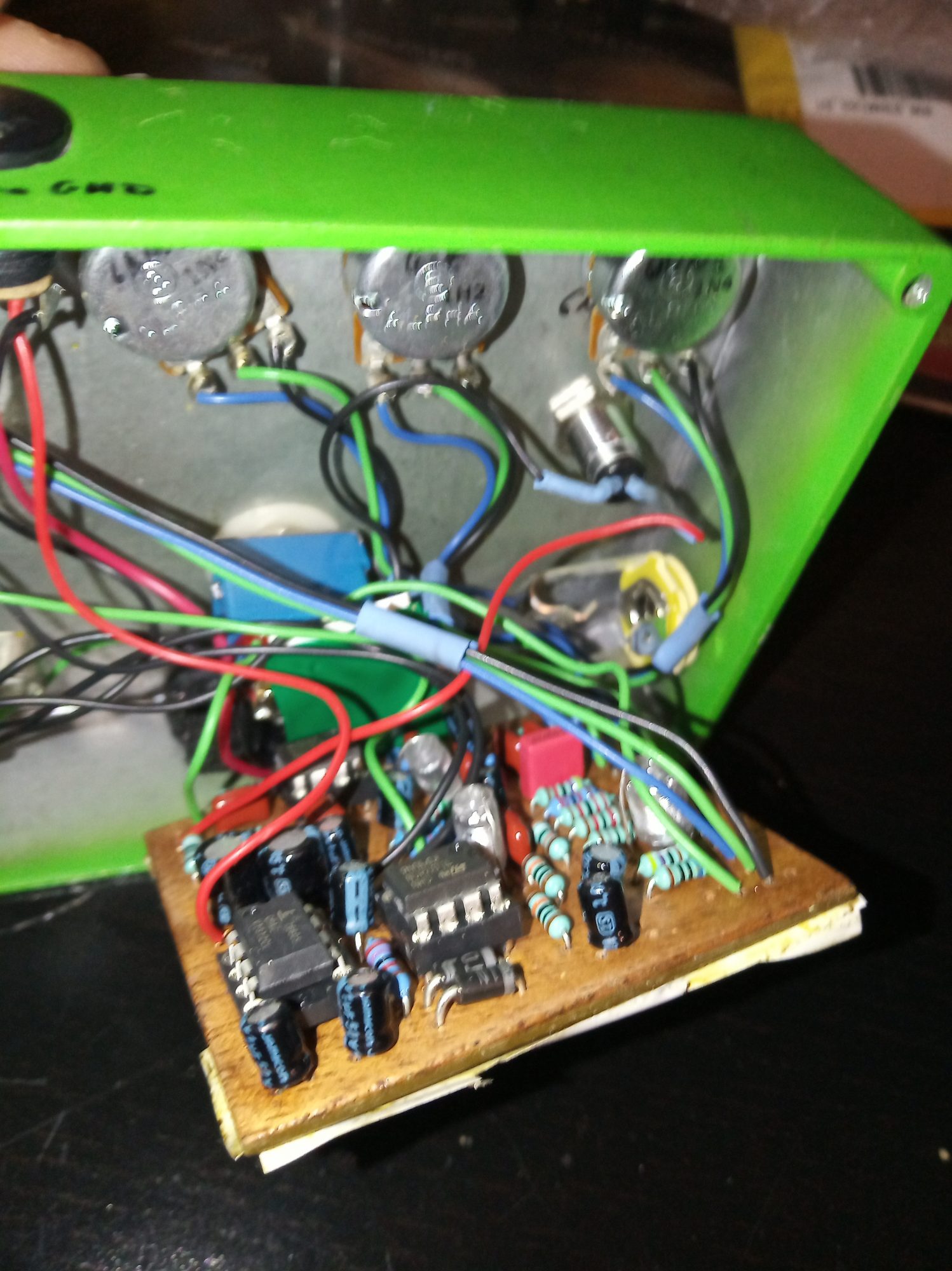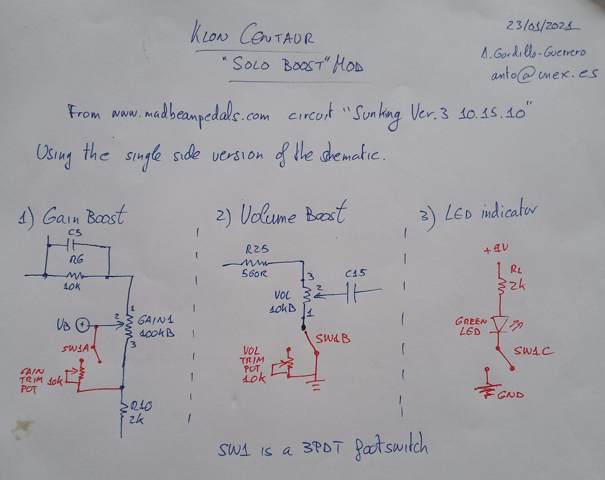 Sobre la modificación de “SOLO BOOST”, puede verse el esquema en los ficheros de descarga “SOLOMOD_schemV1.jpg” y en la galería. Consiste en subir tanto el volumen como la ganancia insertando, o no, resistencias a través de otro conmutador de pie. Estas resistencias se ajustan con potenciómetros internos. El resultado es muy satisfactorio y permite ahorrar un circuito de amplificación aparte. Se consigue un aumento de volumen y ganancia equivalente a subir manualmente los potenciómetros externos correspondientes. Y a este pedal no le falta precisamente volumen o ganancia…