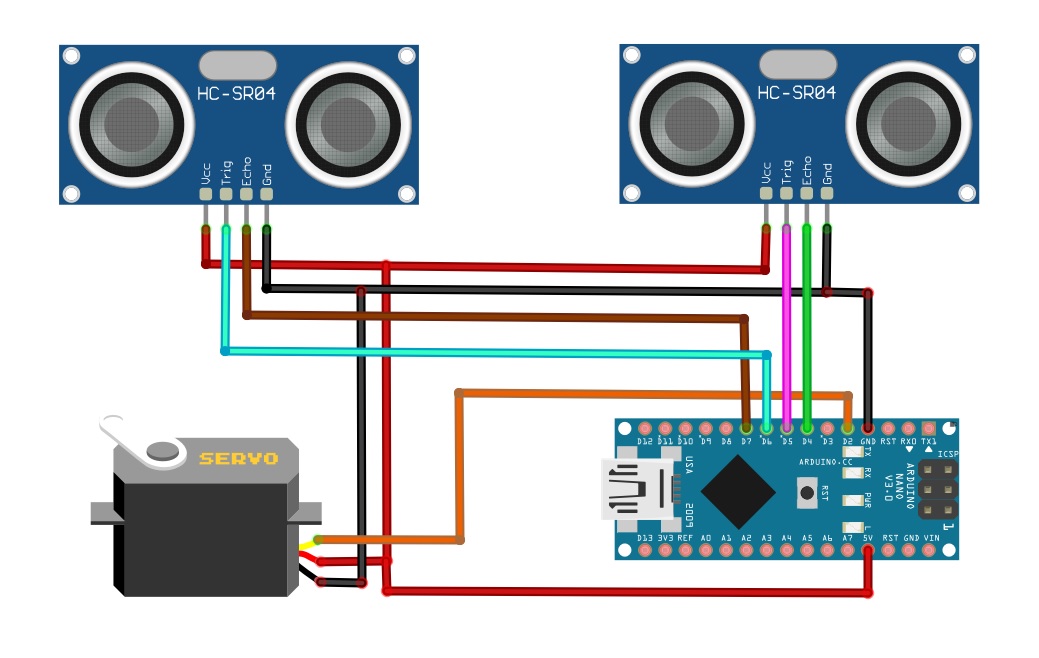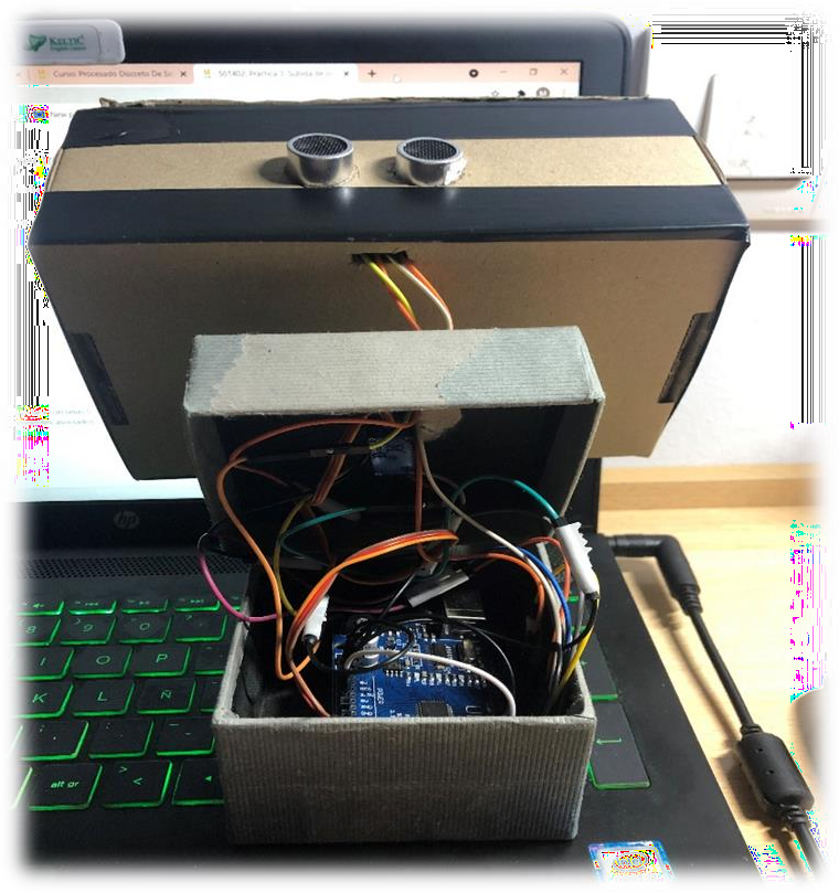 Lo primero que realizamos fue el código base para poder aplicarlo después a la placa y ver si funcionaba. Al ver que la placa respondía correctamente a los comandos del código, procedimos en una mañana a realizar el montaje del hardware del dispositivo. Después de 2 horas de trabajo, a base de cortar cajas de cartón e intenso cableado para conectar los elementos con la placa, conseguimos construir el radar. Finalmente, introducimos el código final con las instrucciones más específicas para completar el proceso y obtuvimos un resultado bastante satisfactorio. La caja que contenía los sensores realizaba los giros correctos y recogía las medidas en el tiempo que habíamos establecido.