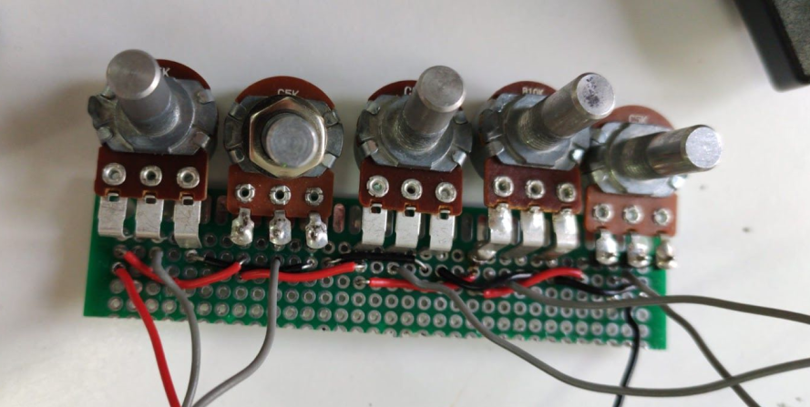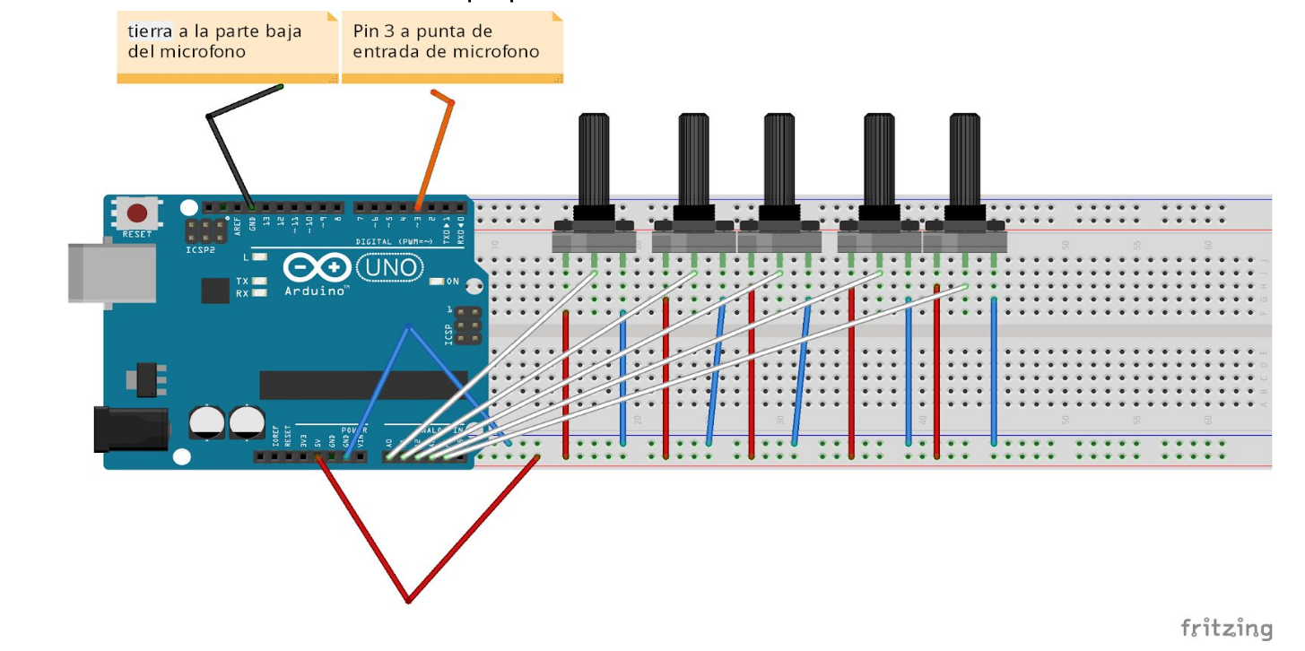 Podemos observar cómo el circuito se reduce al uso de 5 potenciómetros que se conectan directamente al Arduino. Las conexiones positivas (cables rojos) van conexionadas todas al puerto de 5V, las tierras van conectada en al puerto GND, y para el control de los potenciómetros, se conectan a los puertos analógicos (A0-A4). Luego, para la salida, ya sea un jack de audio o directamente un altavoz, se conecta el positivo al puerto 3 del Arduino, y el negativo al puerto GND.